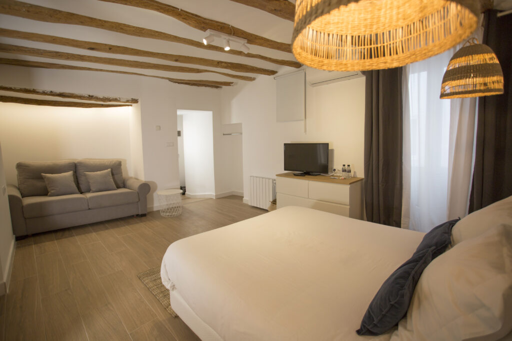 Habitación Suite: Encuentra un alojamiento moderno en nuestro hostal en Alcoy. Tiene 1 habitación con una cama de matrimonio de 1,50 m, cuarto de baño con bañera de diseño, además de todas las ventajas añadidas de nuestro hostal. Nuestra Junior Suite es un espacio donde el confort y la elegancia se encuentran.
