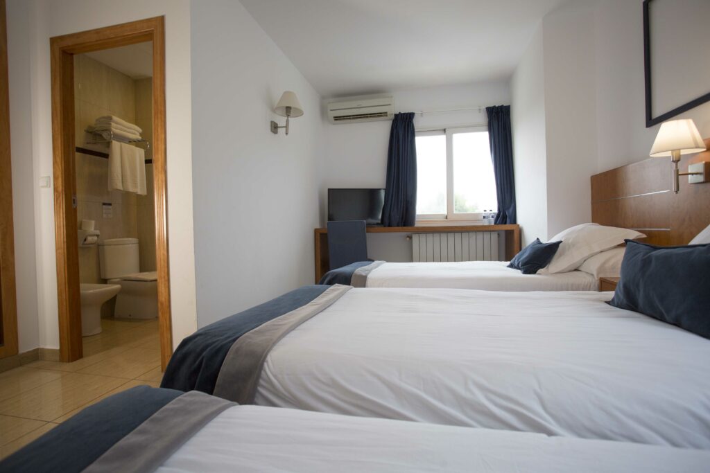 Habitación Triple: Si estas interesado en una habitación triple en Alcoy, las de nuestro hostal cuentan con una cama de matrimonio y una cama de 90 cm o con tres camas de 90 cm. Perfectas para una familia o para 3 amigos que vengan a nuestro salón de eventos en Alcoy por una boda o un evento.