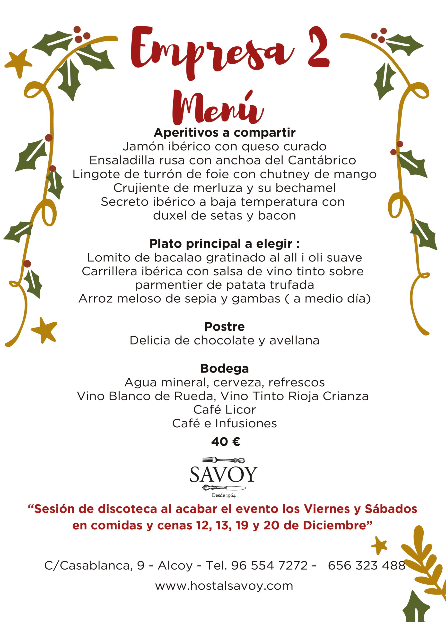 Organiza una comida o cena de empresa inolvidable esta Navidad 2025 en Hostal Savoy, Alcoy (Alicante). Ofrecemos menús para empresas, desde menús tradicionales con un toque innovador hasta opciones de alta cocina que sorprenderán a cada comensal. La Navidad es la ocasión perfecta para fortalecer los lazos en tu equipo y compartir una velada especial en un ambiente acogedor y festivo. Con platos de calidad y una atención excepcional, nuestro equipo se asegurará de que cada detalle de tu celebración navideña sea perfecto. ¡Celebra tu evento de empresa en Alcoy!