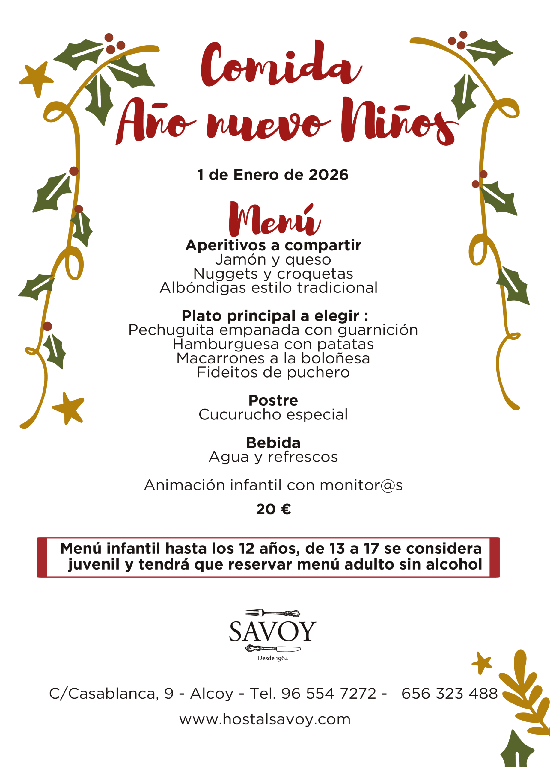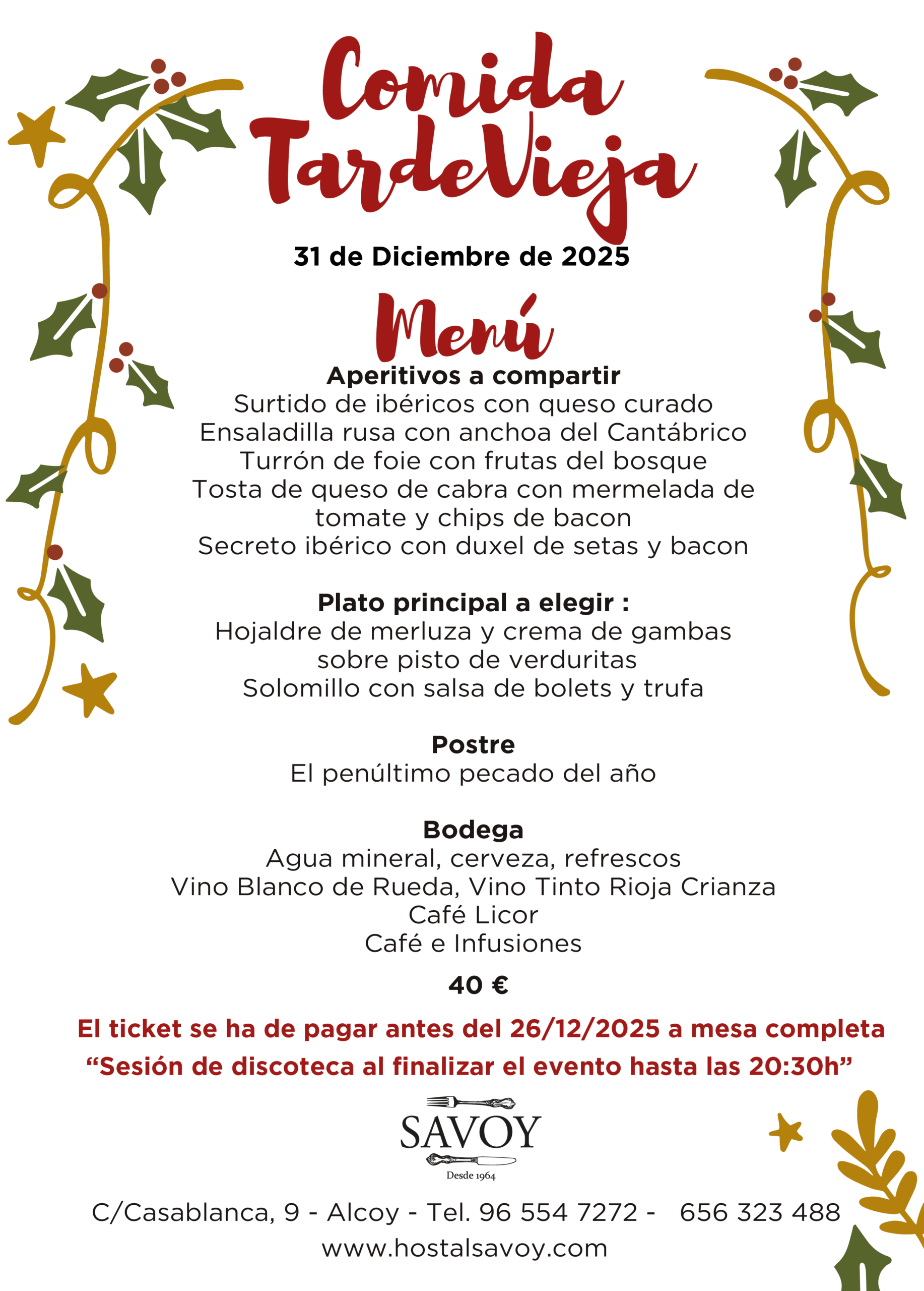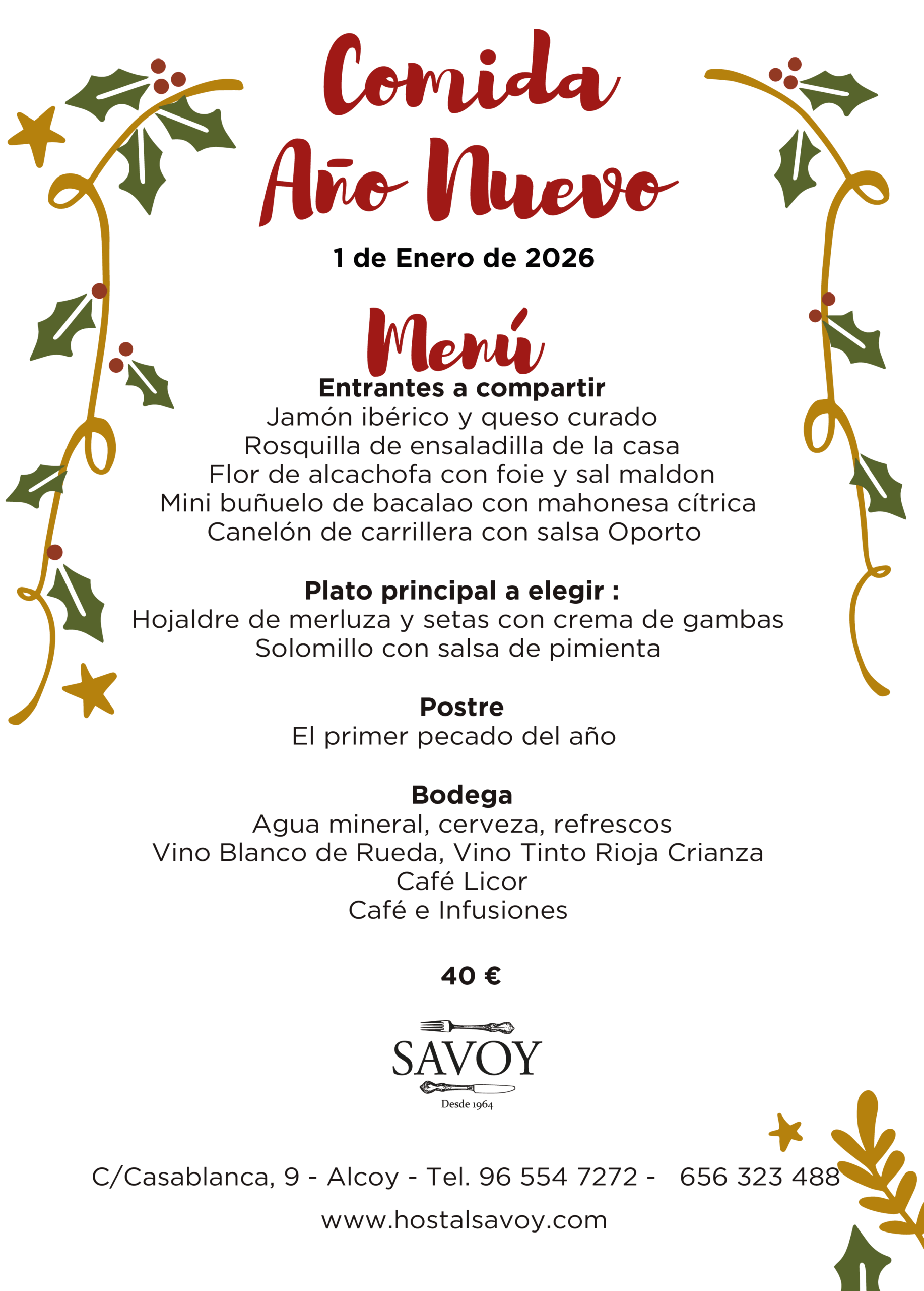Si estás buscando el lugar perfecto para disfrutar de una cena especial en Nochevieja o Navidad, el Hostal Savoy es tu mejor opción en Alcoy. Con un ambiente festivo, menús elaborados y un servicio impecable, aseguramos que tu experiencia será inolvidable. ¡Reserva tu mesa hoy y no te quedes sin plaza!